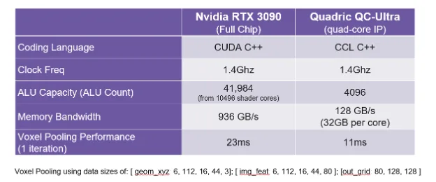 You are probably already thinking: “OK, fine, you can run Voxel Pooling. But at what speed? If its not fast, it’s not useful!” Fear not! The implementation of Voxel Pooling on the Chimera GPNPU is actually faster than the original CUDA code running on a 450 Watt Nvidia RTX3090 board (with GT102 GPU chip). The Chimera GPNPU core – burning just a couple of Watts of power dissipation (your mileage will vary depending on the process node and clock frequency, and choices of off-chip memory interface) outperforms the 450W full chip GPU by a factor of 2X.