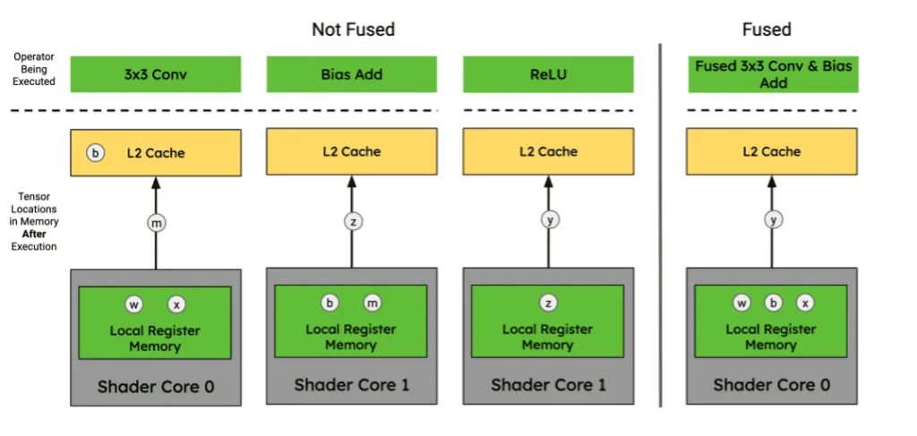 Fusing convolutional layers, bias adds, and activation function layers, like NVIDIA’s TensorRT tool did in Figure 2, is an extremely common choice for operator fusion. Convolutions and activation functions can be decomposed into a series of matrix multiplication operations followed by element-wise operations that look something like: